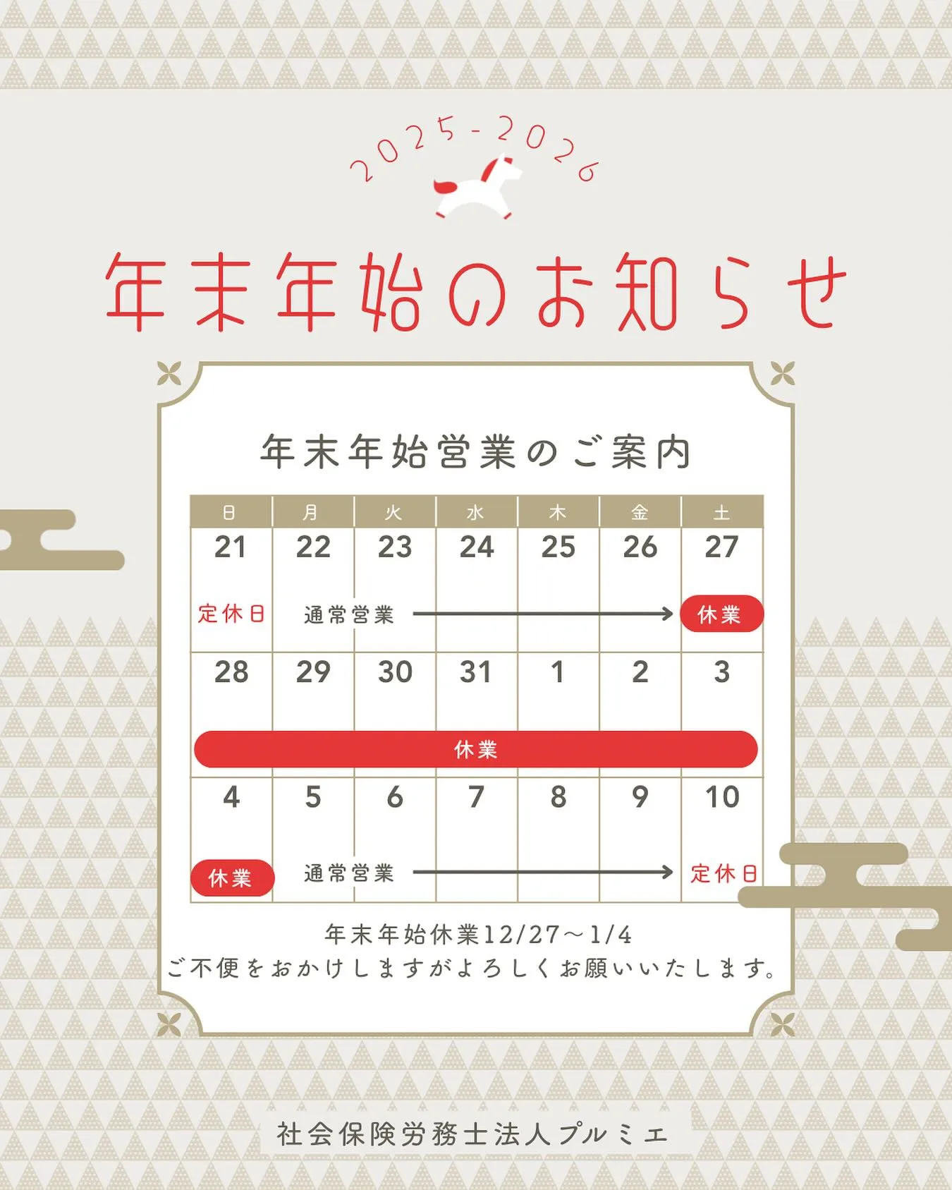 少し早いですが年末年始の営業日についてお知らせいたします🍀